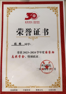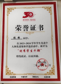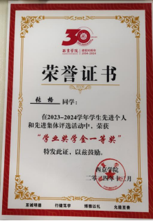 2022—2023学年,获西京学院奖学金“二等奖”、土木工程学院“智育之星”荣誉称号;2023-2024学年,获西京学院“优秀班干部”荣誉称号、西京学院奖学金“一等奖”、国家励志奖学金;2024年,获第十四届全国大学生市场调查和分析大赛校赛“三等奖”、西京学院第十三届“溧阳杯”土木工程制图大赛(尺规绘图组)“优秀奖”。
