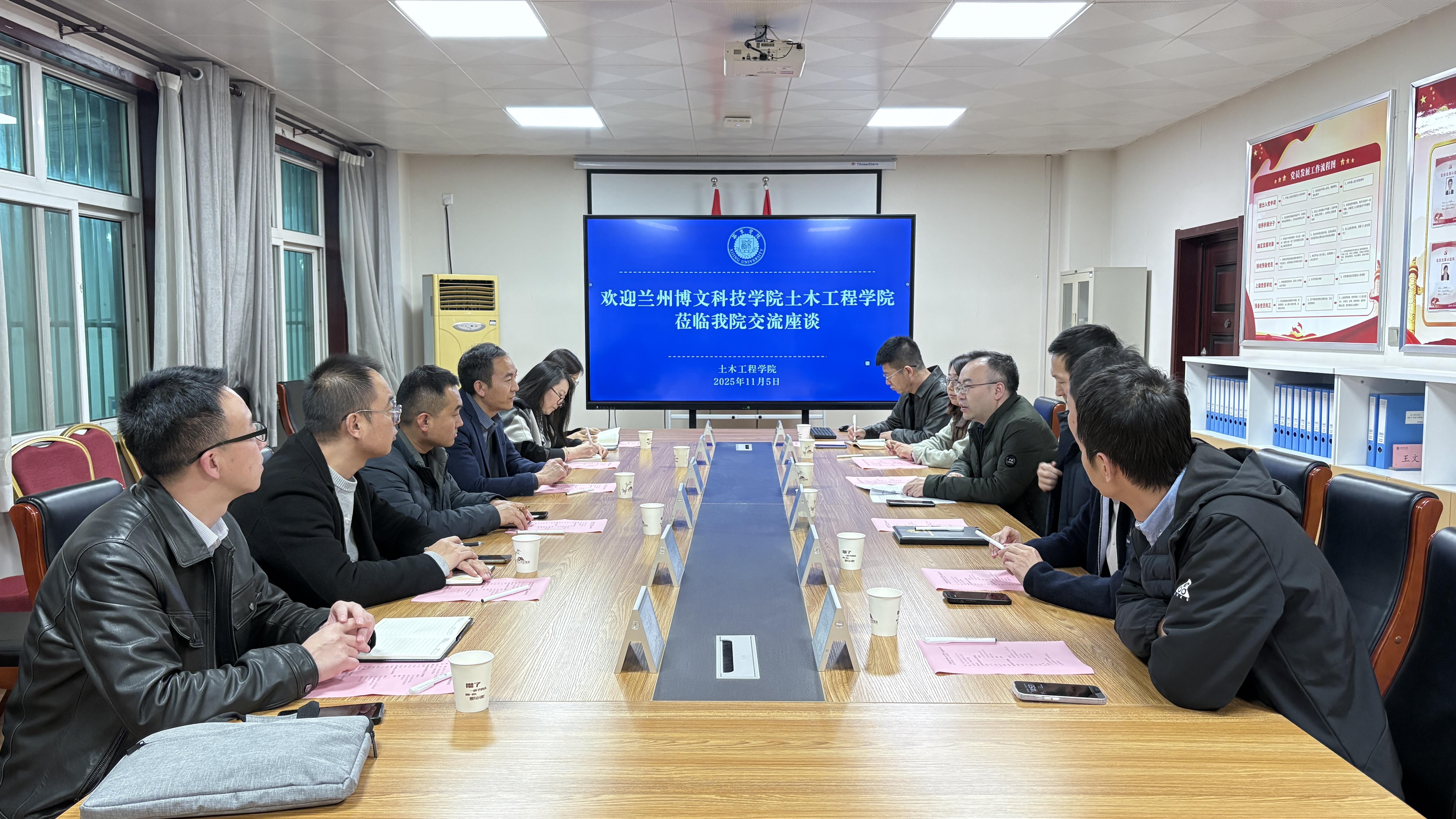 11月5日,兰州博文科技学院土木工程学院副院长苏彦军一行6人莅临我校土木工程学院开展交流座谈。土木工程学院土木工程系主任郭培玺、岩土与道桥教研室主任习羽、办公室主任张创业、学科办主任何世丹、实验中心主任王利东出席座谈,学院副院长张海龙主持会议。